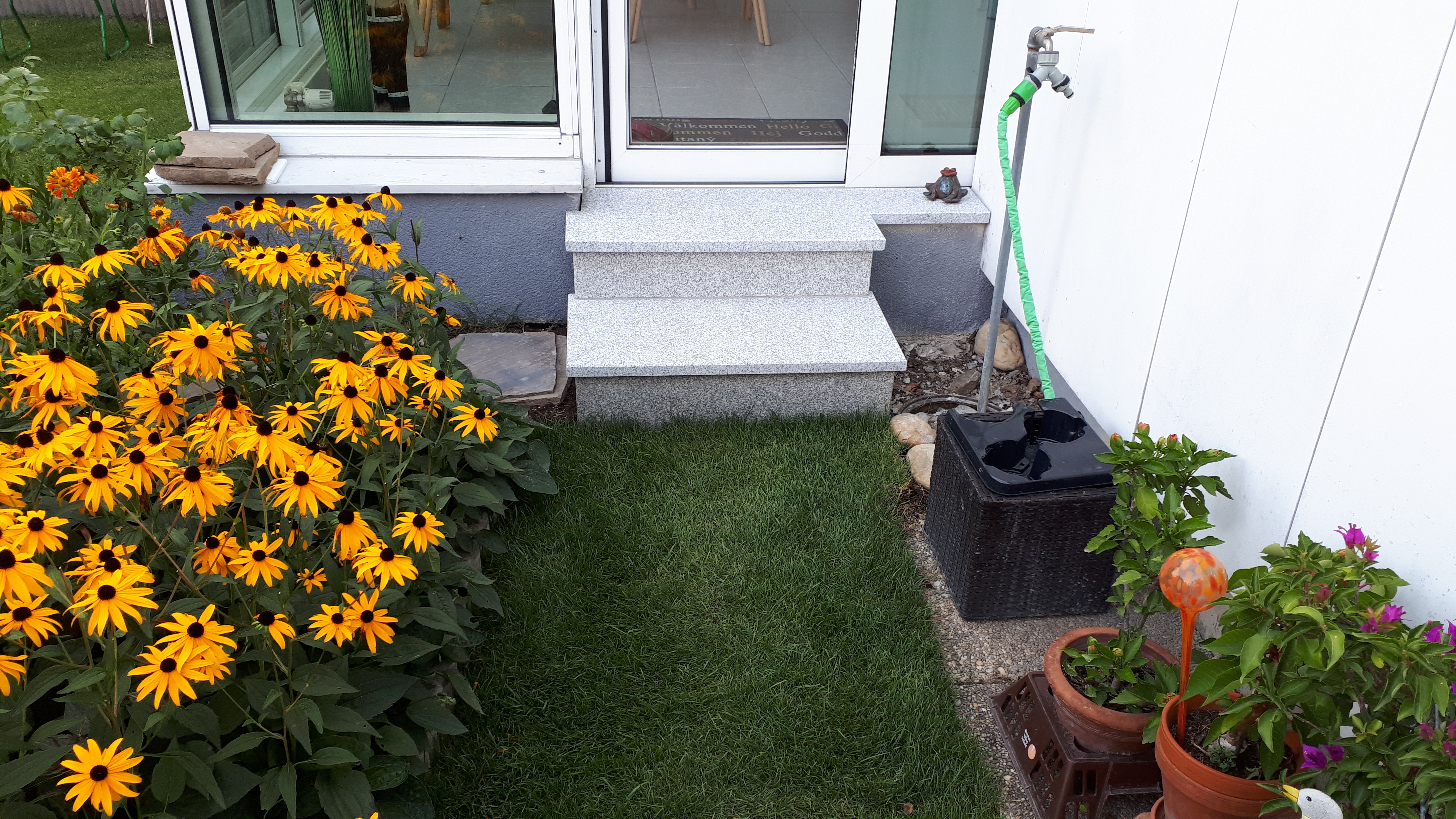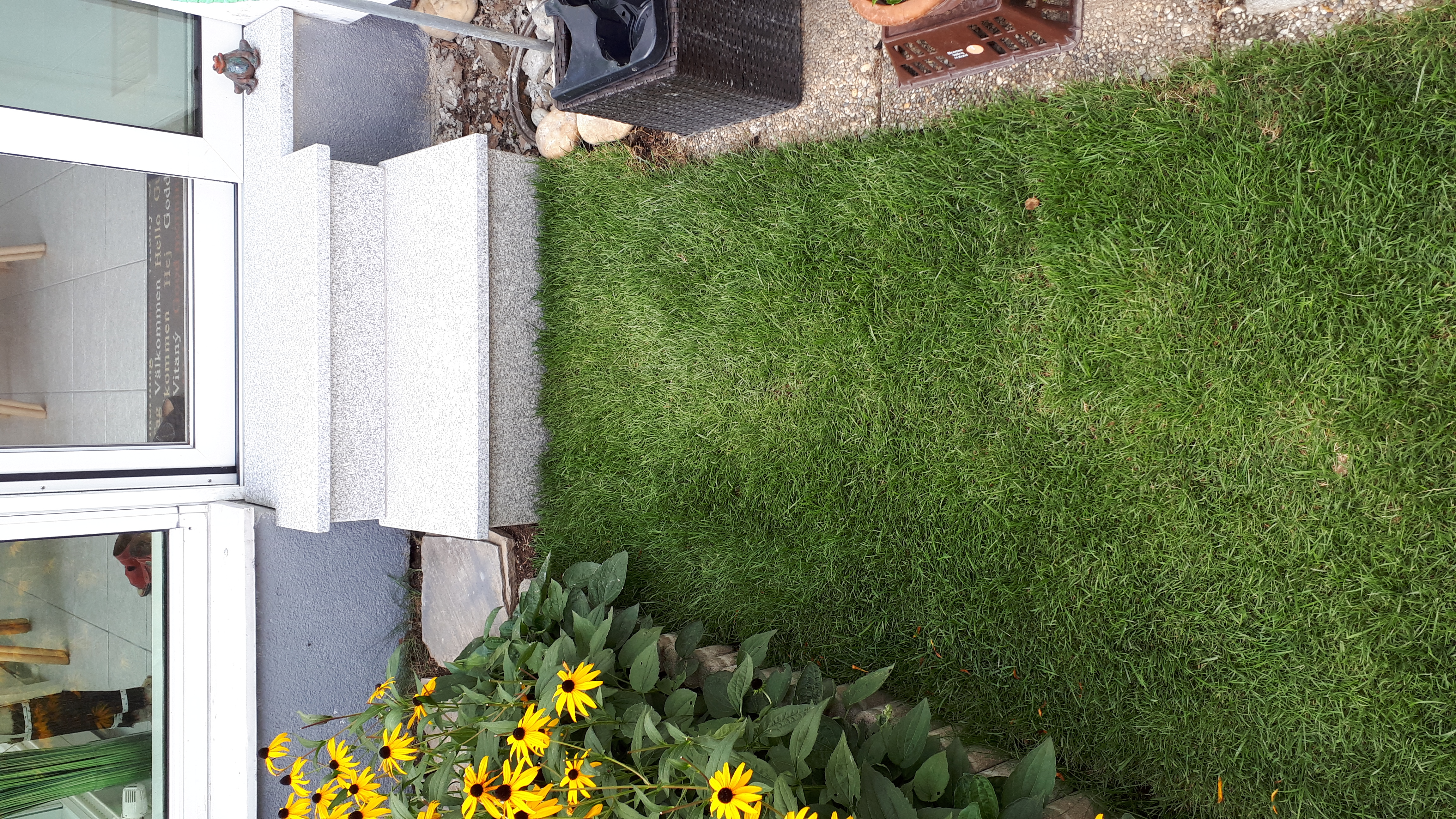 # Fertigrasen mit Natursteinplatten ("Trittsteine") im vorgelagerten Rasenbereich