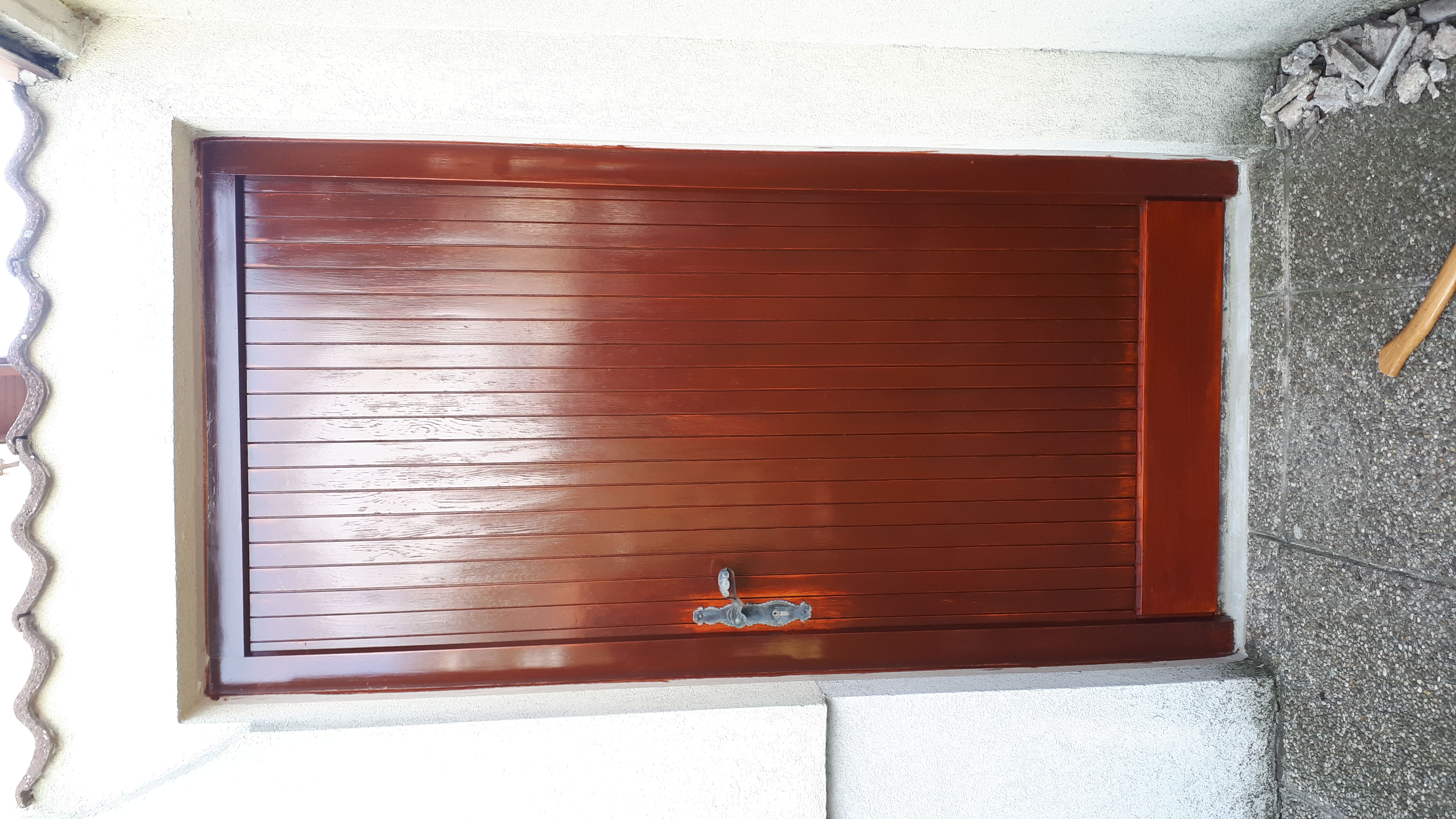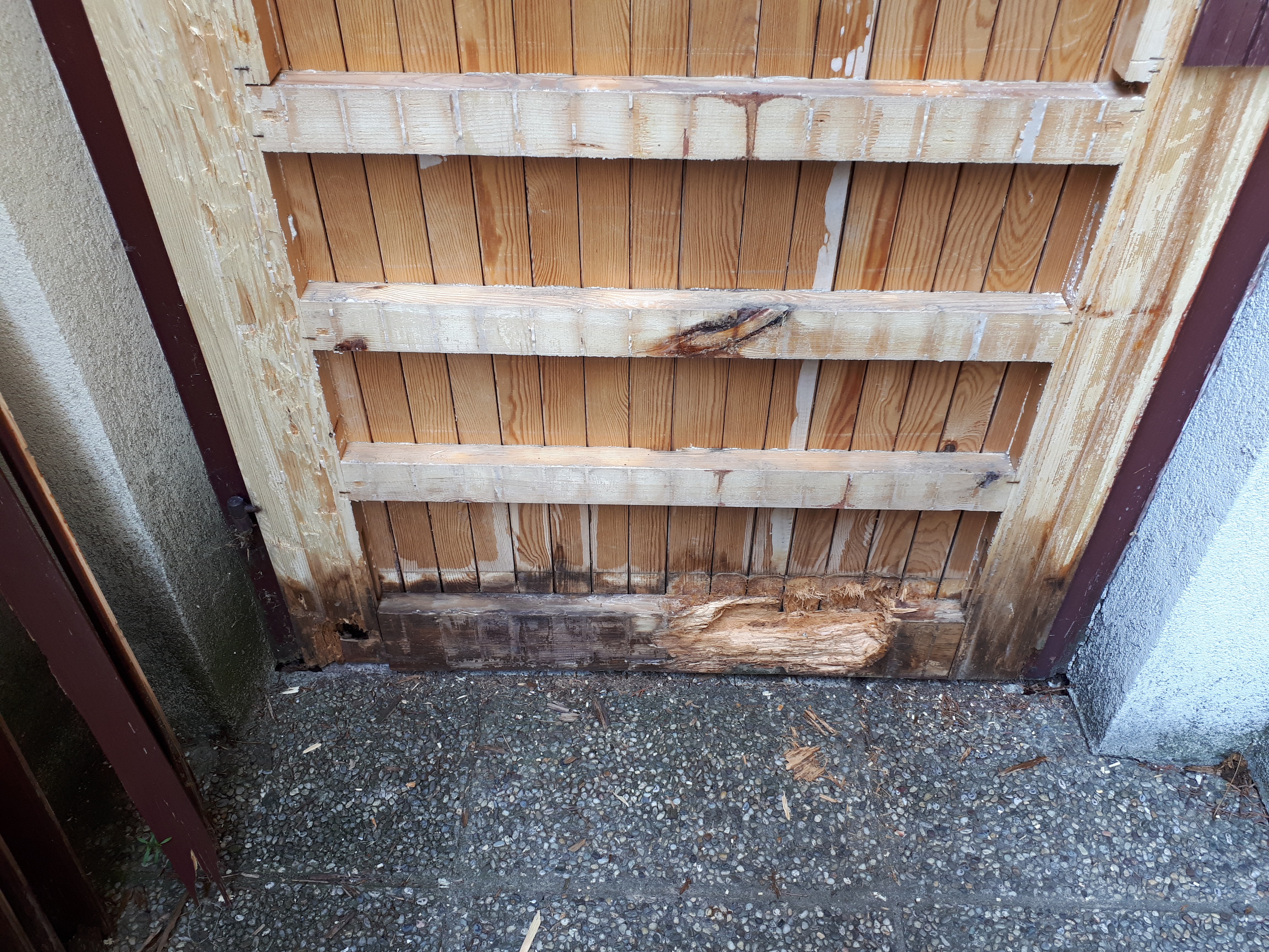 Lösung: Der untere Teil des Rahmens wurde neu angefertigt und eingebaut, aus Lärchenholz. Gartenseitig wurde am Türrahmen eine neue Holzschalung angebracht.