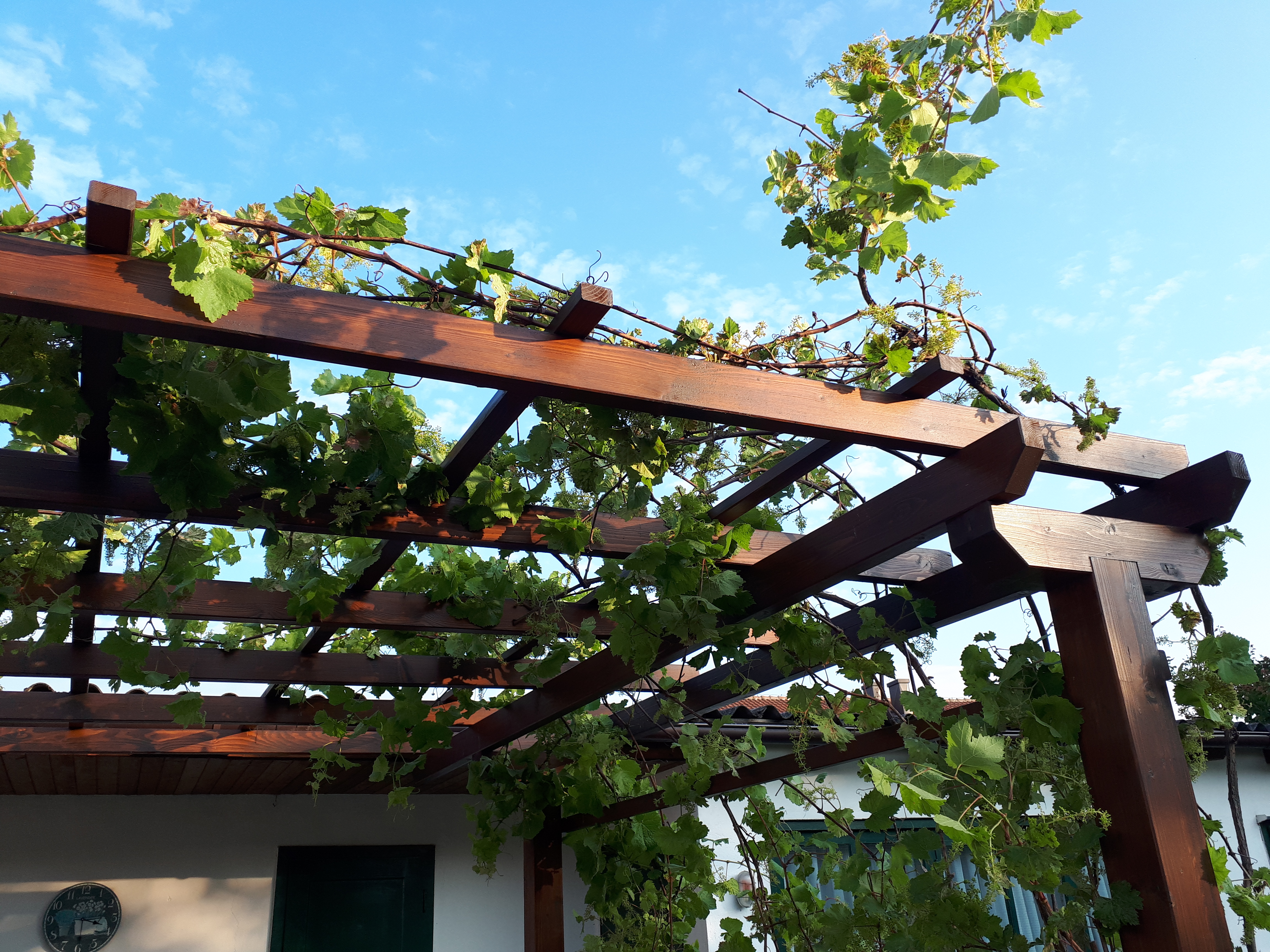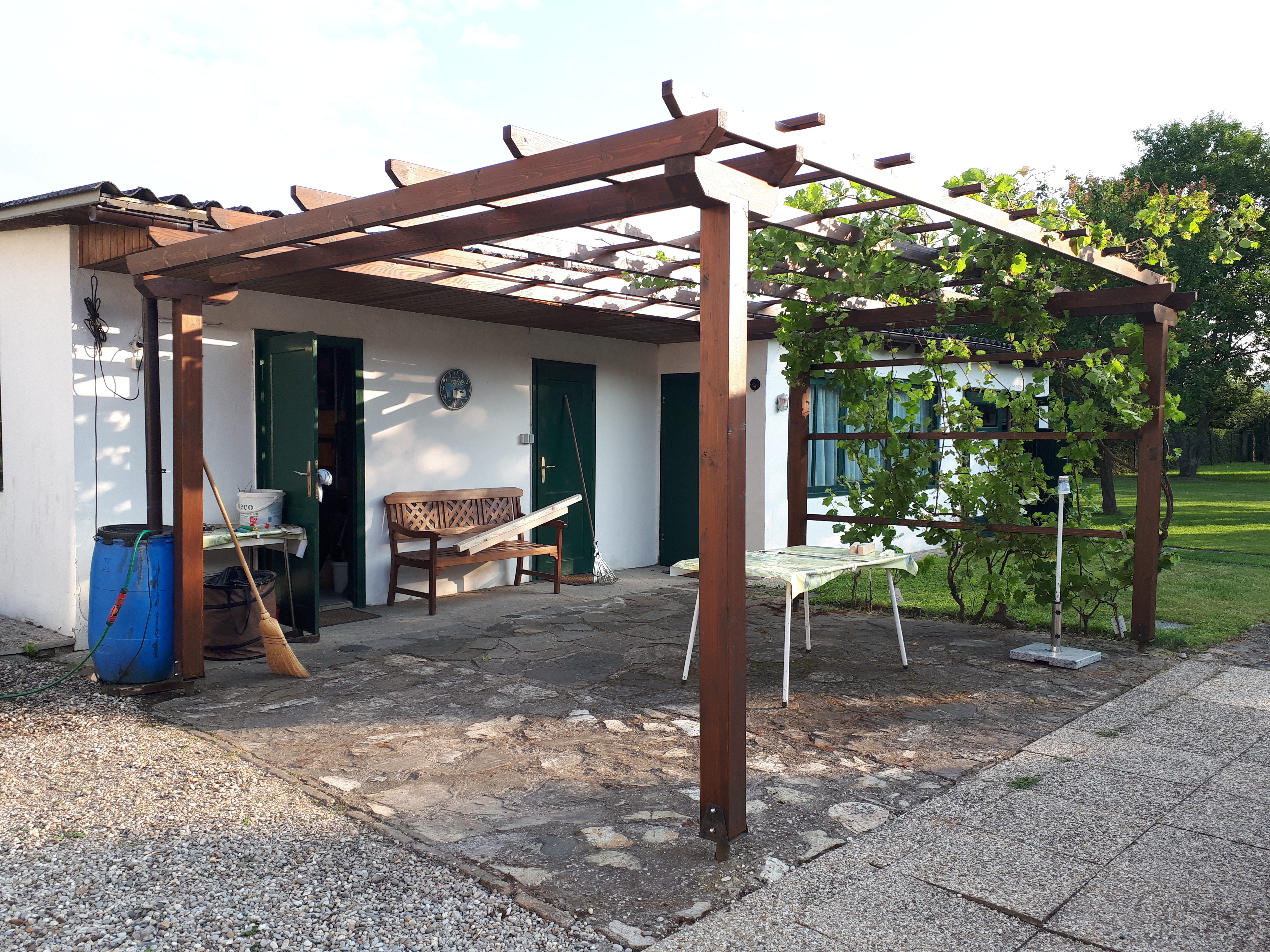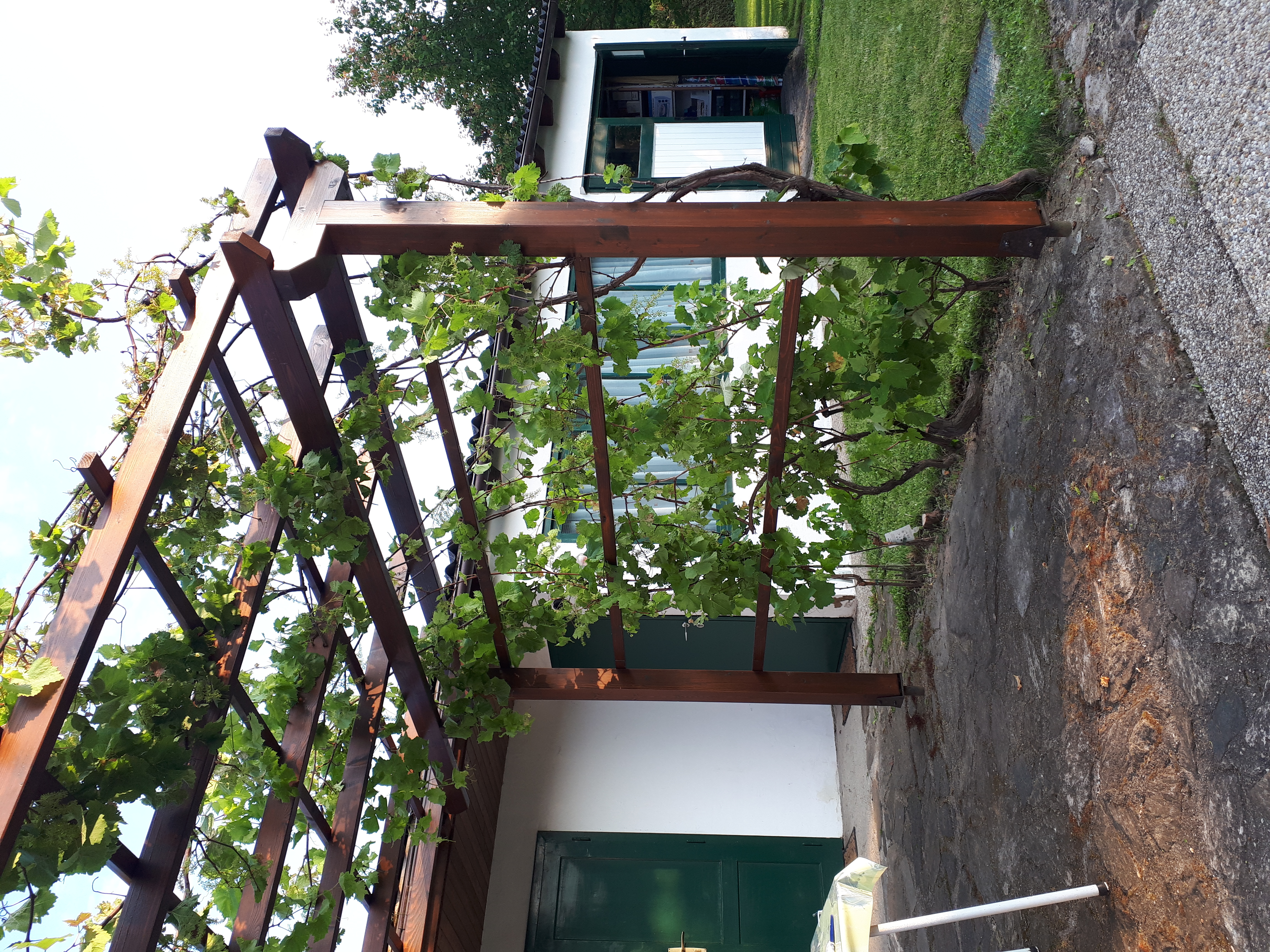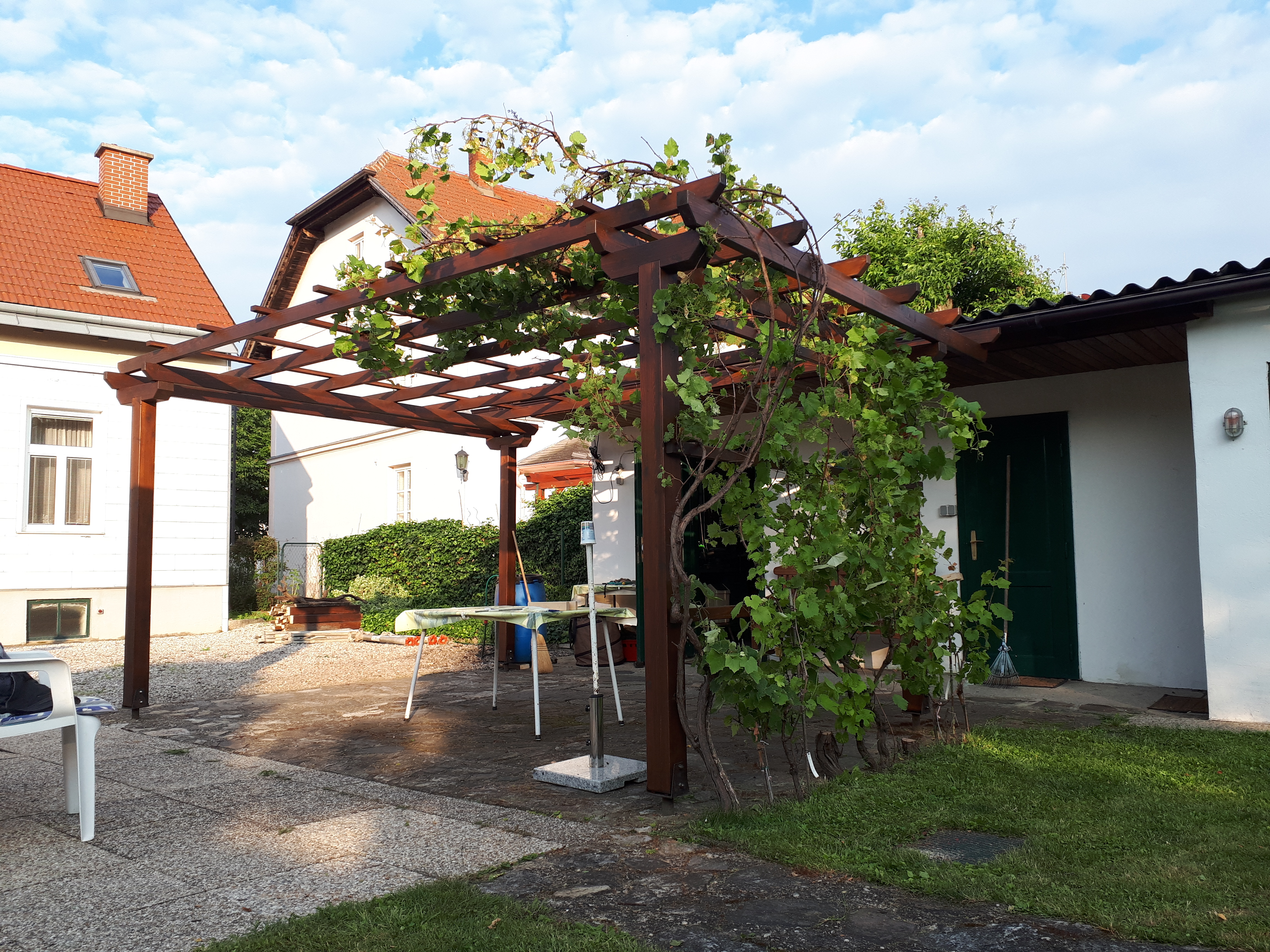 Neubau Laube: Holzkonstruktion & Weinreben (natürlicher Sonnen- und Sichtschutz)