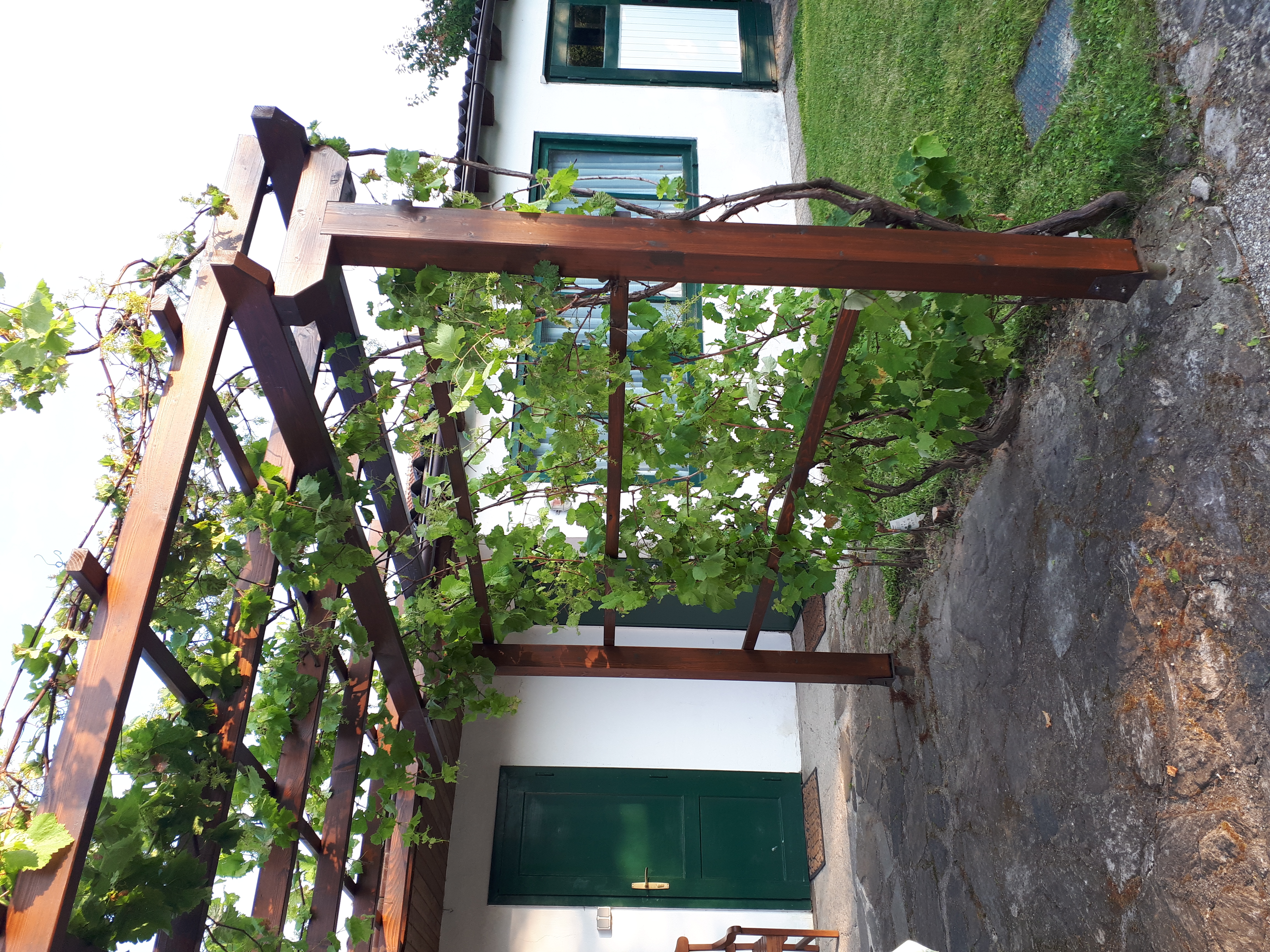 # Die bestehenden Reben/Triebe konnten vorsichtig bei den Abbauarbeiten freigelegt und somit zur Gänze in die neuen Lattungen, der neuen Laube, gestrickt werden.