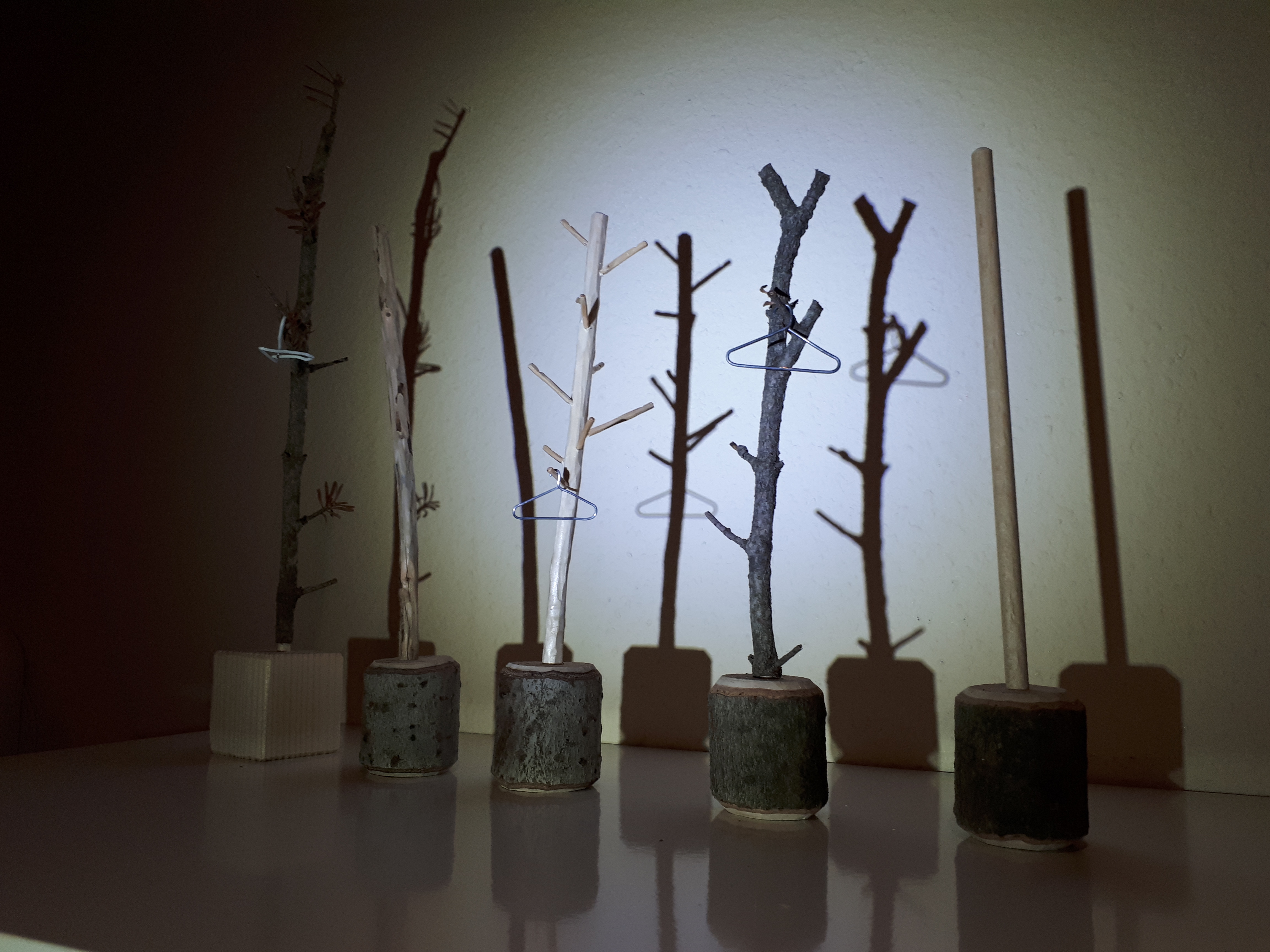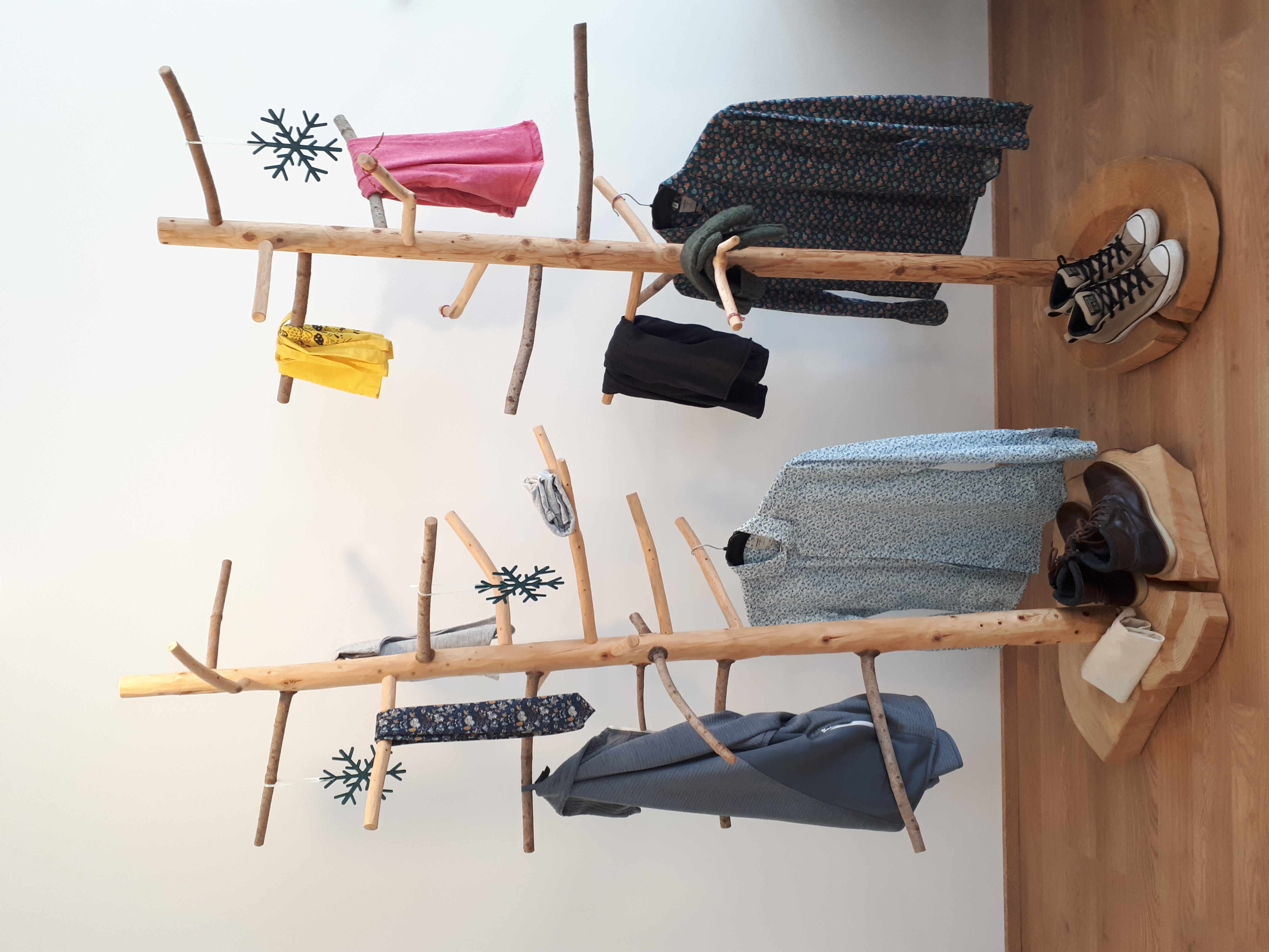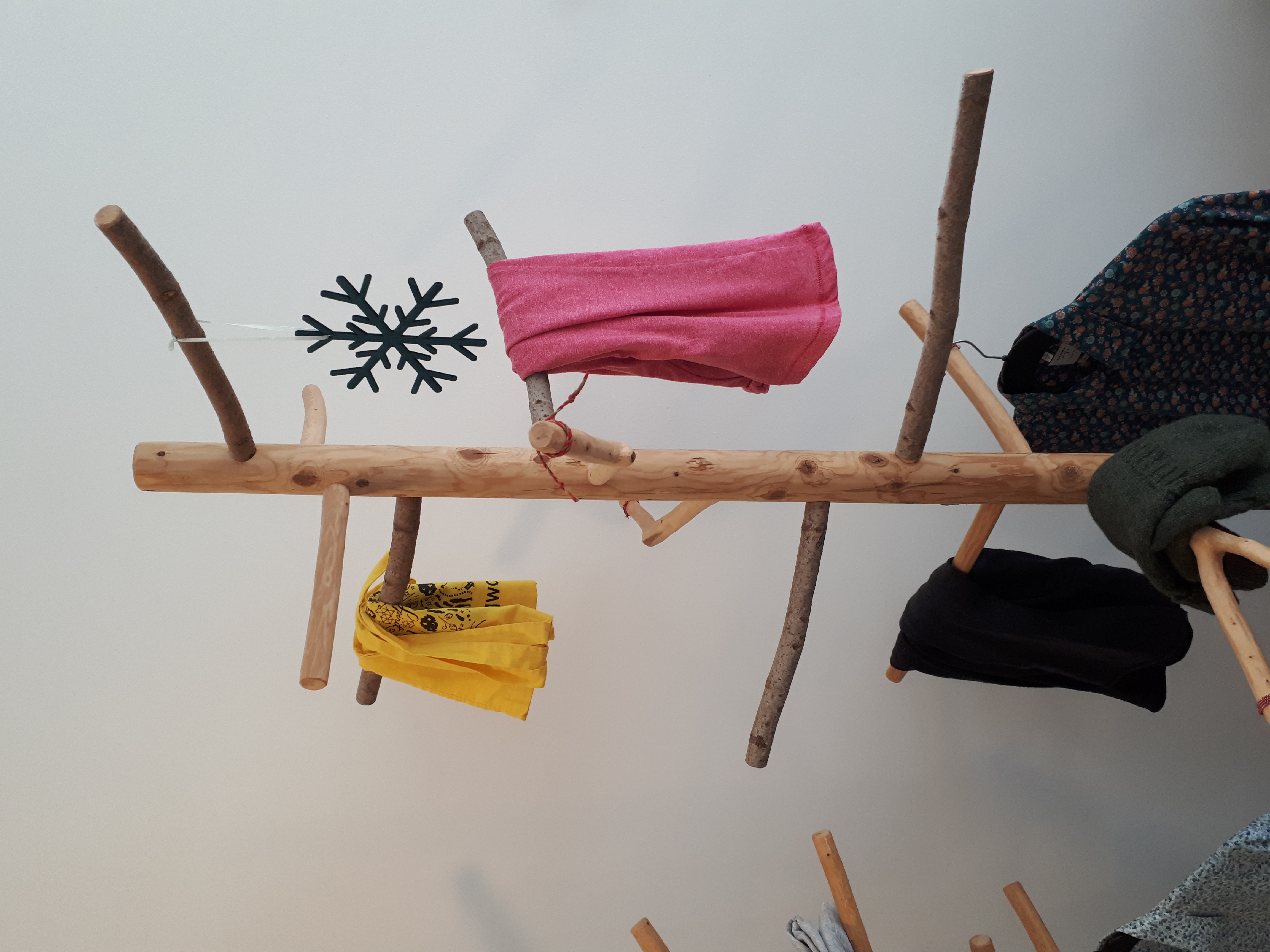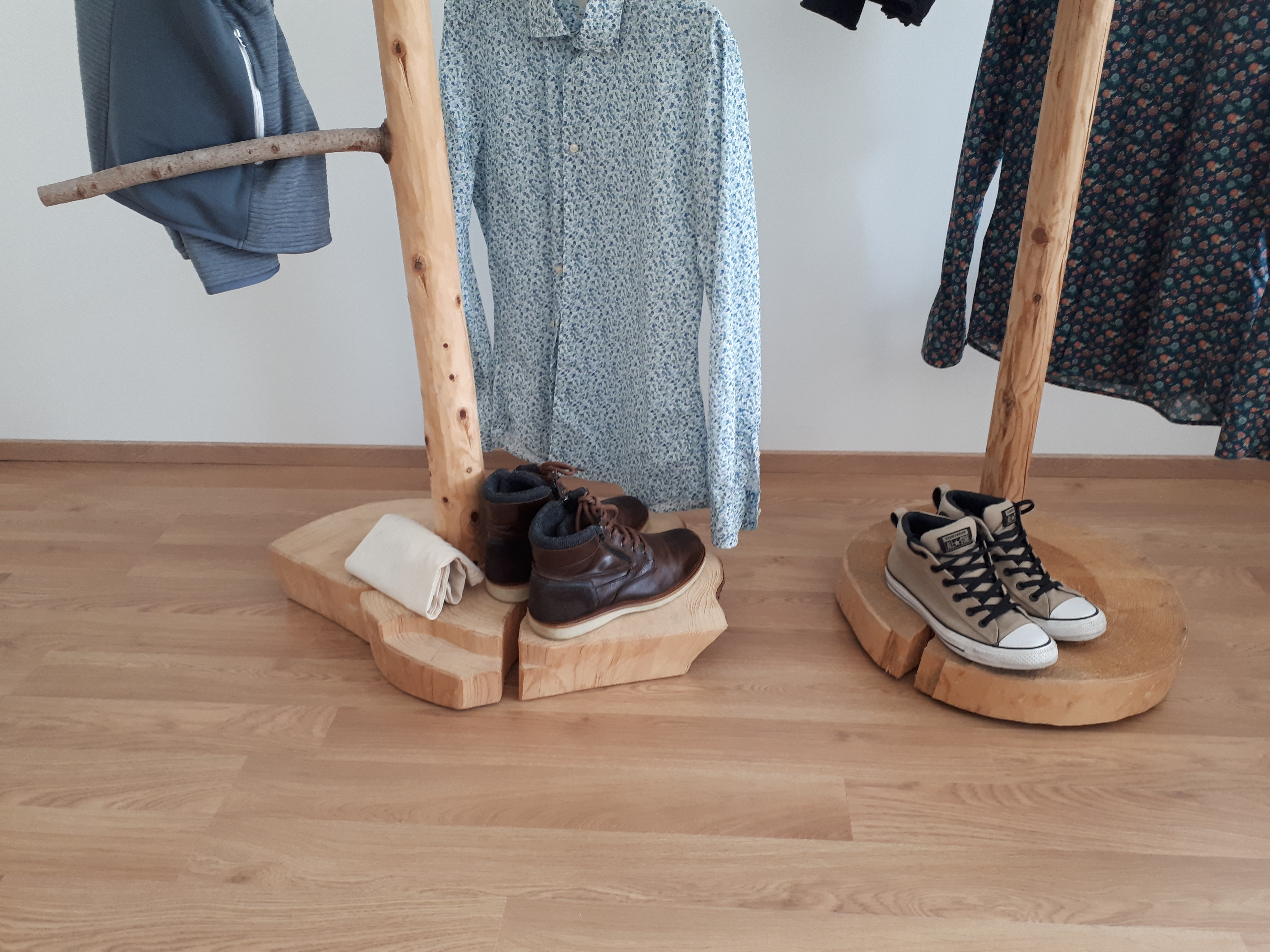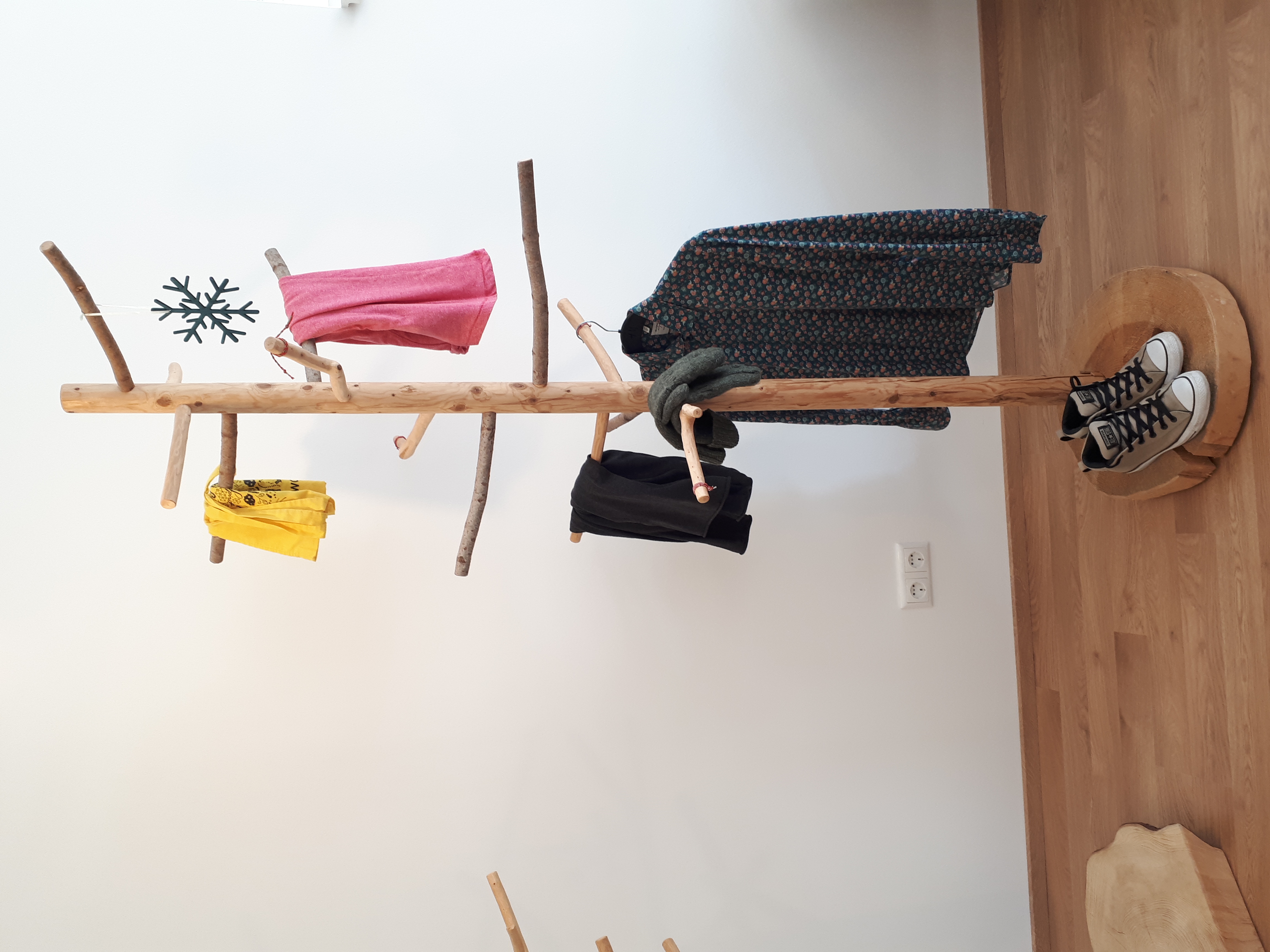 Auch Dekoelemente, Schlüssel, Hüte, Mützen, Schals, Handschuhe, Handtücher, Baumwolltaschen finden einen geeigneten Ast. Auf der Bodenbaumscheibe können Schuhe, Körbe, Taschen und Rucksäcke abgestellt werden.